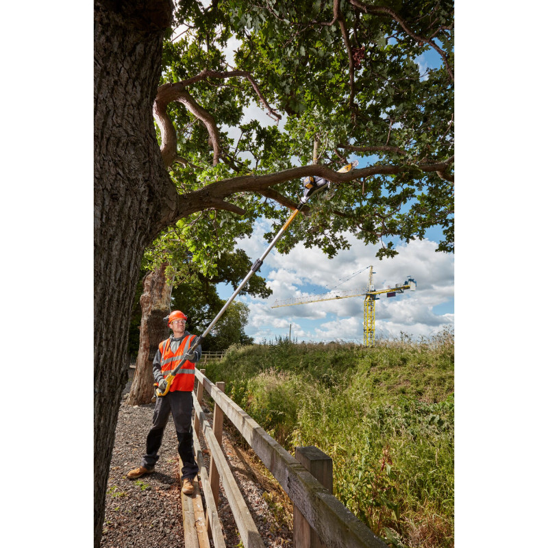 DeWALT DCMPS567N is a cordless pole saw with a 20 cm bar and angled head for better control during limbing. Reaches up to 4.5 m with extension pole. Brushless motor delivers up to 55 cuts (100x100 mm) per charge. Lightweight aluminium body. Battery and charger not included.