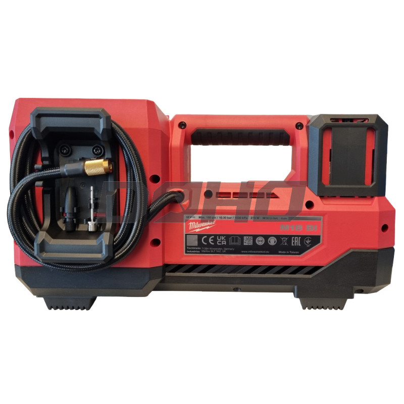 Milwaukee M18 BI-0 akumuliatorinis oro kompresorius yra kompaktiškas ir lengvas – puikiai tinka automobilių, lengvųjų sunkvežimių ir mažesnių įrenginių padangoms pripūsti. Didžiausias slėgis – 10,3 baro, o automatinis išsijungimas užtikrina tikslų pripūtimą. Su viena M18 5,0 Ah baterija galima pripūsti iki 30 padangų. Komplekte – įvairūs adapteriai skirtingiems vožtuvams.