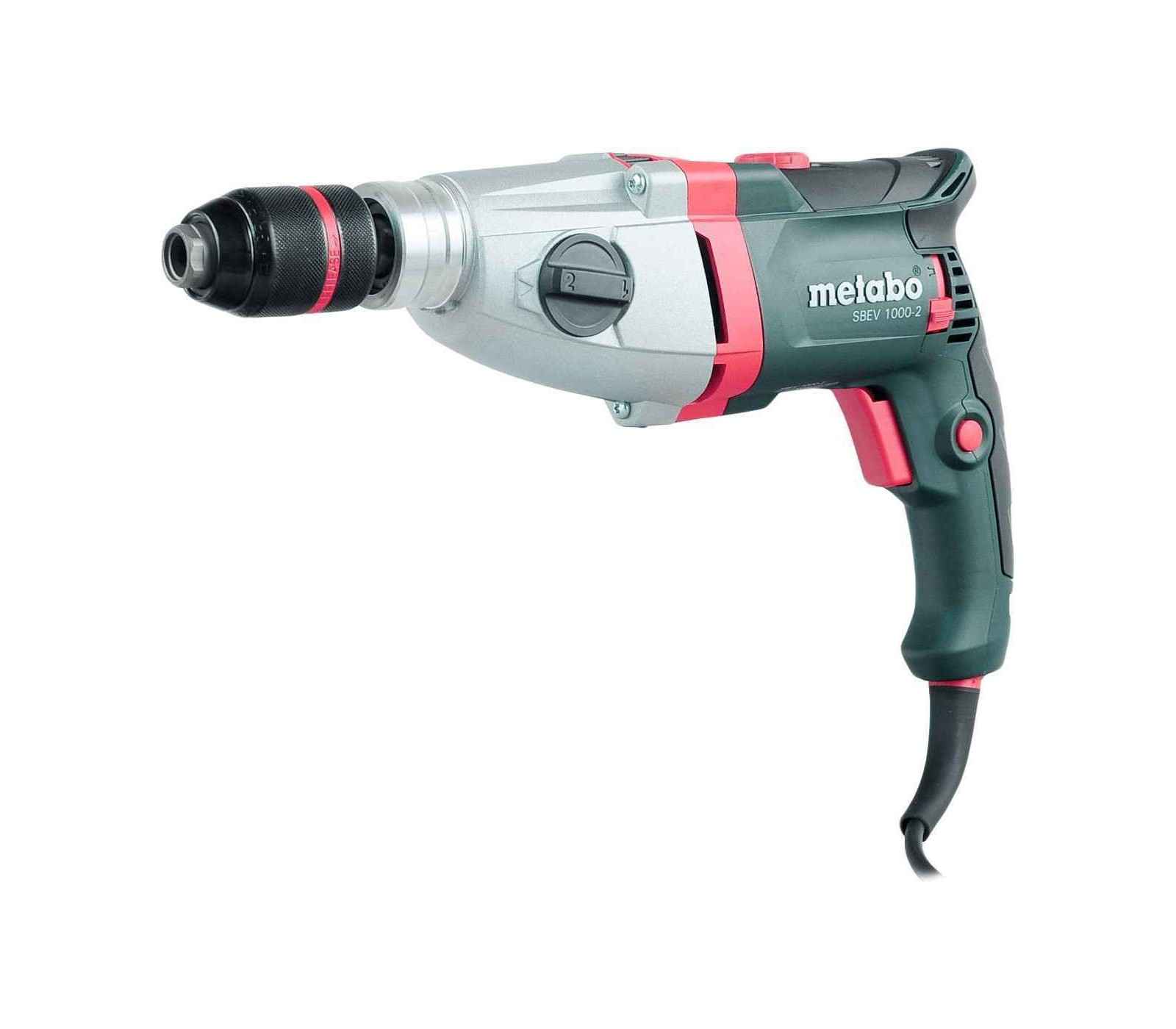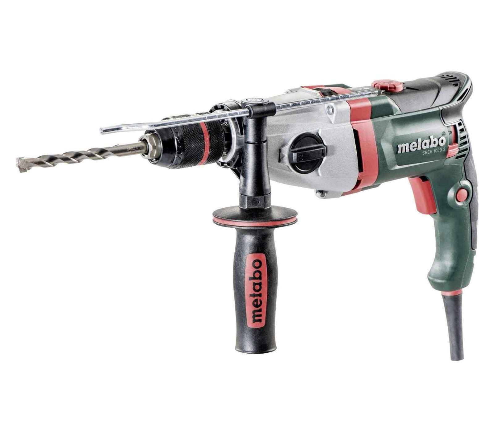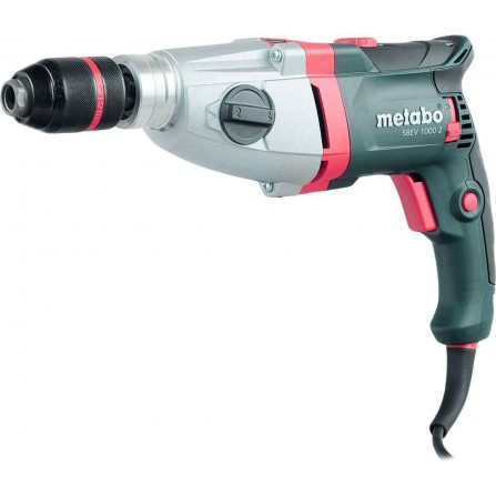 The Metabo SBEV 1000-2 Electric Impact Drill (1010 W) is a powerful tool for universal drilling tasks. With a two-speed gearbox and a maximum torque of 40/14 Nm, it excels in drilling into masonry, concrete, steel, and wood. The Vario Tacho Constamatic (VTC) electronics maintain a consistent speed under load, ensuring optimal performance. It features a durable aluminum gear housing, a dust-protected Metabo Marathon motor, and a safety clutch for safe operation. The drill includes a rotating carbon brush bridge for maximum power, and is equipped with a metaBOX for convenient transport and storage.