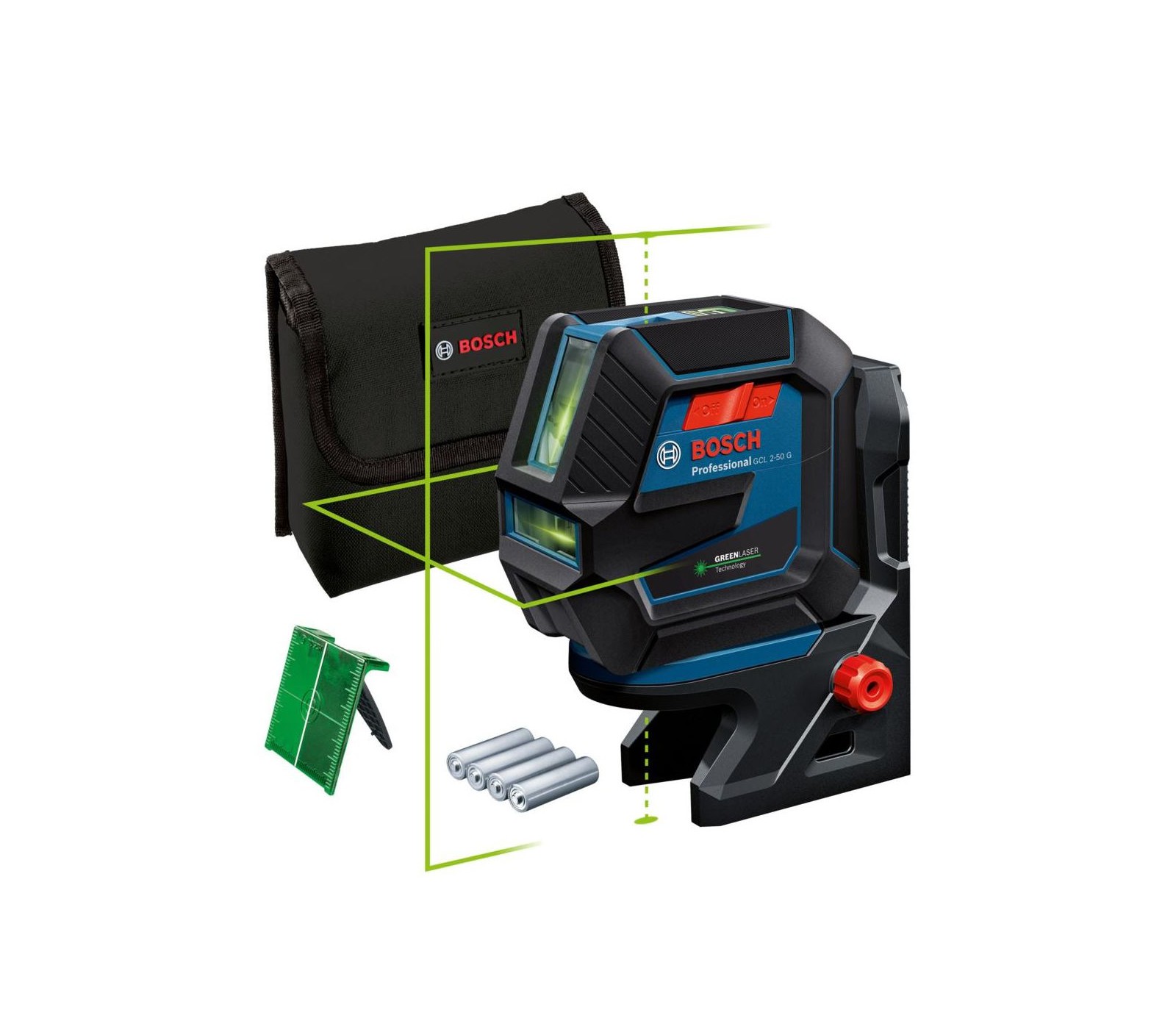 Bosch GCL 2-50 G – tai akumuliatorinis lazerinis nivelyras su ryškiomis žaliosiomis linijomis ir svambalo taškais. Tvirtas, su IP64 apsauga nuo dulkių ir vandens, ir gumuotu korpusu, puikiai tinka darbui sunkiomis sąlygomis. Paprastas valdymas vienu mygtuku. Naudokite lentynų montavimui, karkasų statybai ar plytelių klojimui. Veikia iki 15 m, su imtuvu – iki 50 m. Saviguosa per 4 s. Maitinamas 4 AA baterijomis, svoris – 0,58 kg.