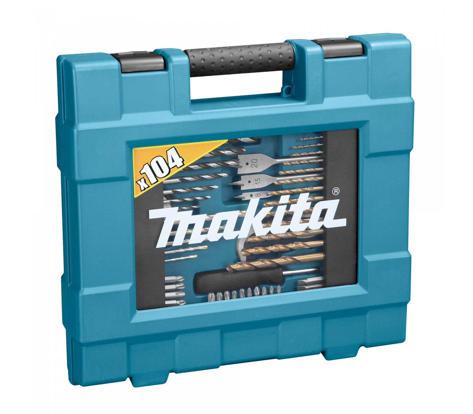 Makita D-31778 Drill and Screwdriver Bit Set, 104 pcs – A versatile set for working with metal, wood, and masonry. The package includes 14 HSS-TiN drill bits for metal, 10 wood drill bits, 6 masonry drill bits, 1 depth stop, 5 drill stops, 58 screwdriver bits, 2 bit holders, and 4 screwdriver heads. All components are neatly packed in a plastic case for convenient storage. A total of 104 parts for various drilling and screwing tasks.